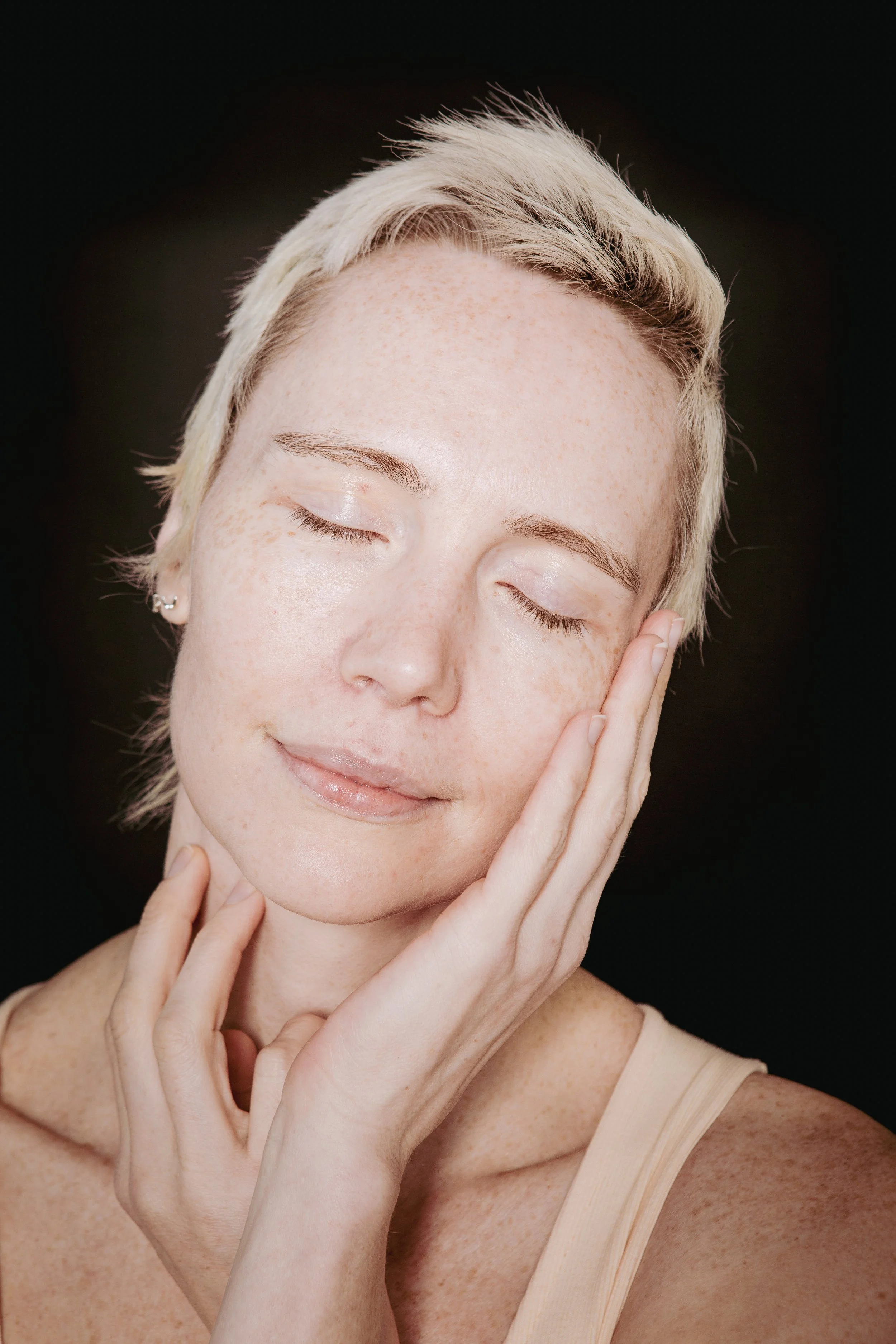 Hold the Gua Sha at a 45-degree angle from the skin and massage in an upwards direction away from the center using long strokes across your face in a sculpting motion.